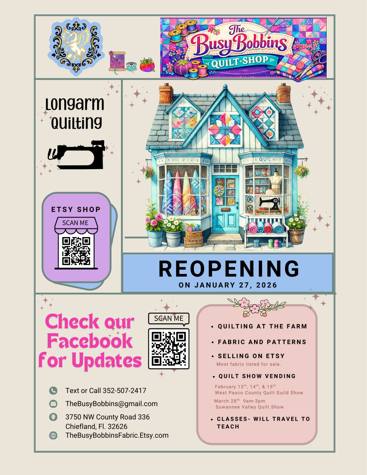 Phone: (352) 507-2389Email: thebusybobbins@gmail.comHours: Wednesday thru Friday, 10am until 4pm Saturday, 10am until 2pm